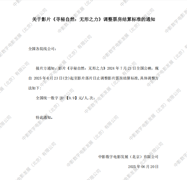 《寻秘自然:无形之力》调整票房结算标准的通知