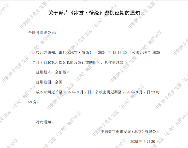 关于影片《冰雪·情缘》第八次密钥延期的通知