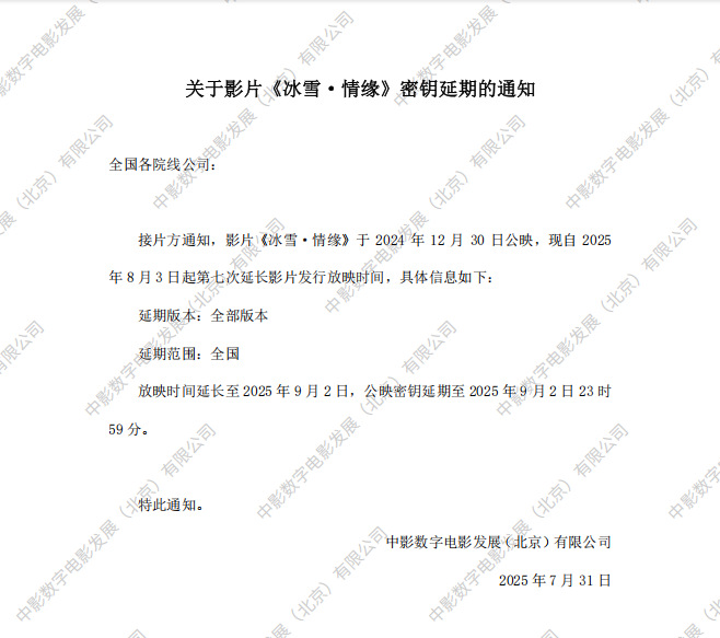 关于影片《冰雪·情缘》第八次密钥延期的通知