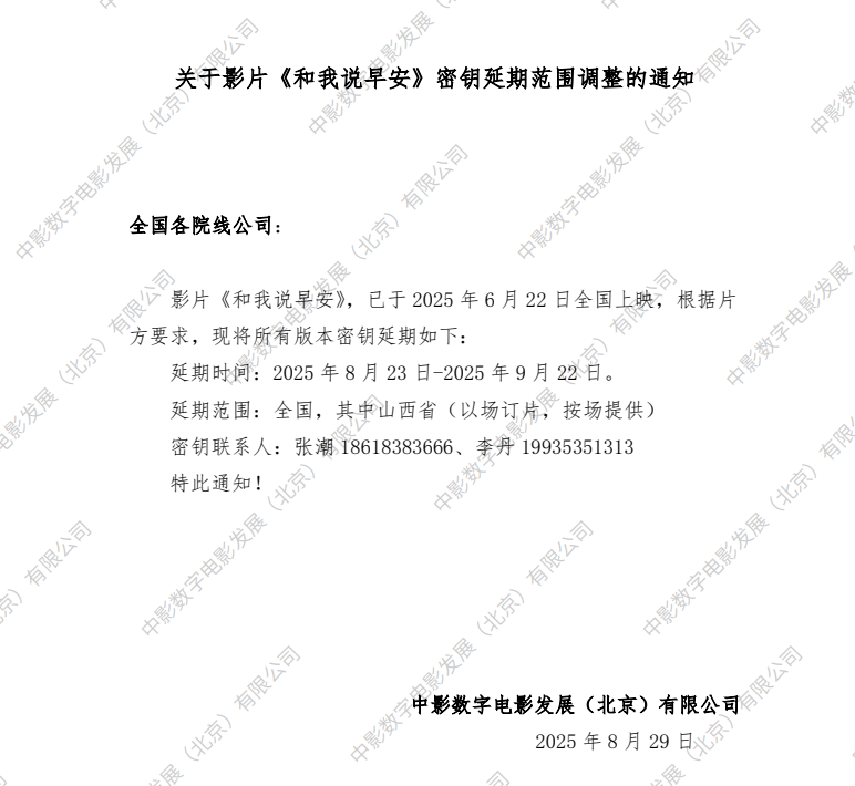 发行通知 » 关于影片《和我说早安》密钥延期范围调整的通知