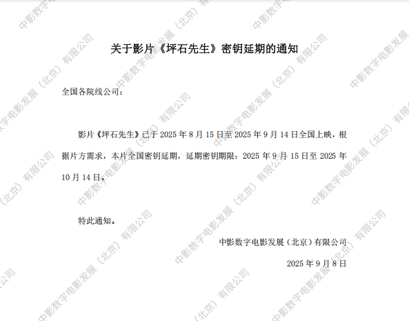 《坪石先生》第五次全国密钥延期及调整票房结算标准的通知