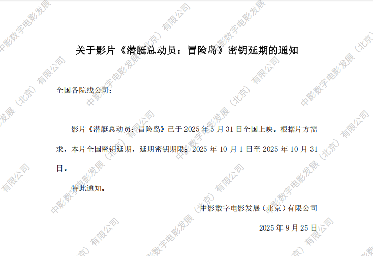 关于影片《潜艇总动员:冒险岛》密钥延期的通知