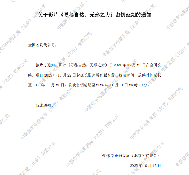 《寻秘自然:无形之力》调整票房结算标准的通知