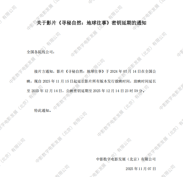 关于影片《寻秘自然:地球往事》15次密钥延期的通知