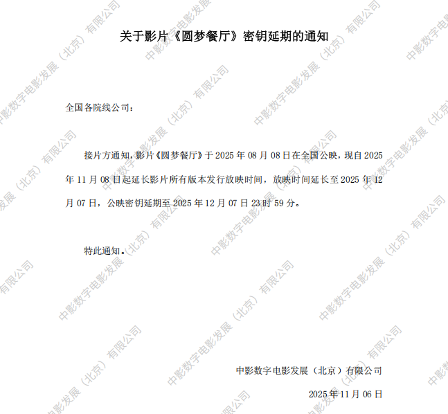关于影片《圆梦餐厅》2次密钥延期的通知