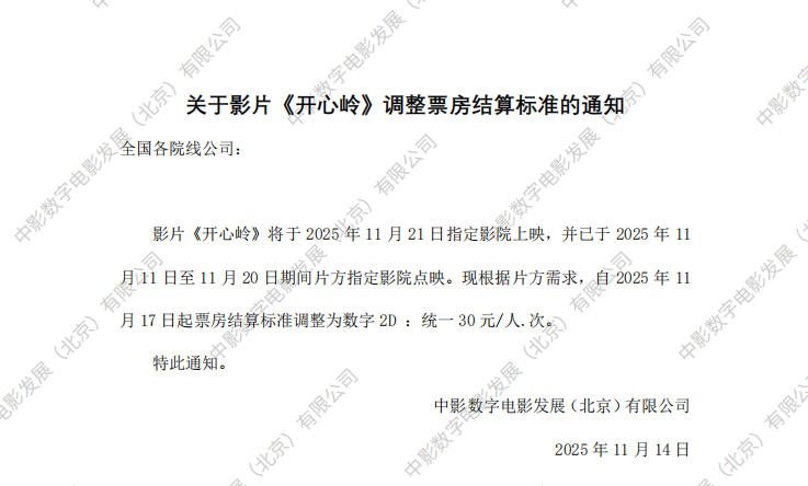 《开心岭》变更上映范围的通知