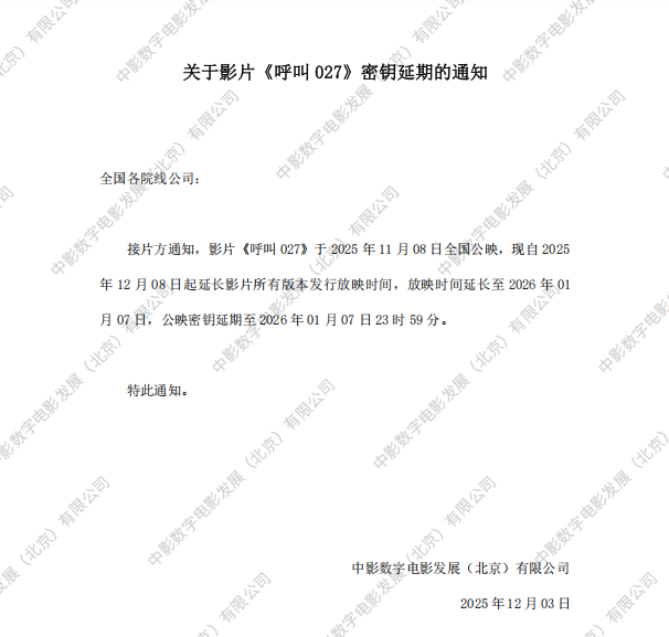 《呼叫027》密钥延期的通知