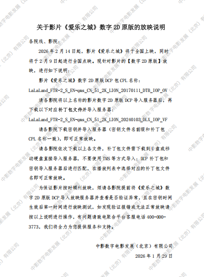 发行通知 » 《爱乐之城》数字2D原版的放映说明
