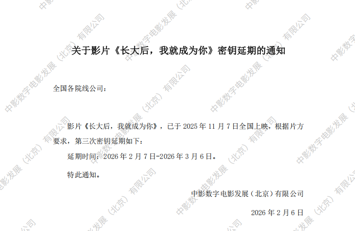 关于影片《长大后,我就成为你》第二次密钥延期的通知