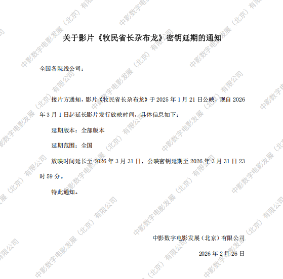 《牧民省长尕布龙》第十二次密钥延期的通知
