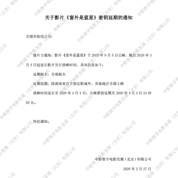 发行通知 » 《窗外是蓝星》第六次密钥延期的通知