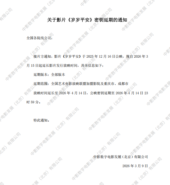 发行通知 » 关于影片《岁岁平安》第三次密钥延期的通知