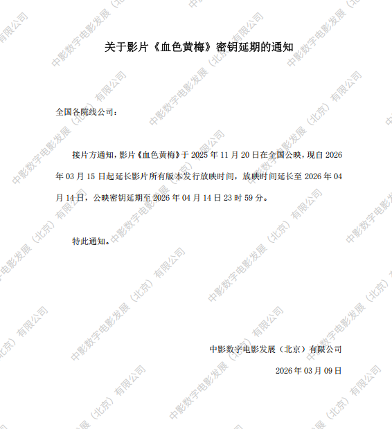 发行通知 » 关于影片《血色黄梅》密钥延期的通知