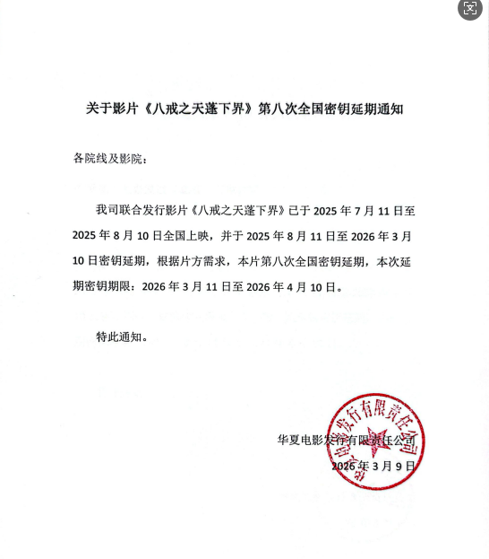 发行通知 » 致院线-关于影片《八戒之天蓬下界》第八次全国密钥延期通知