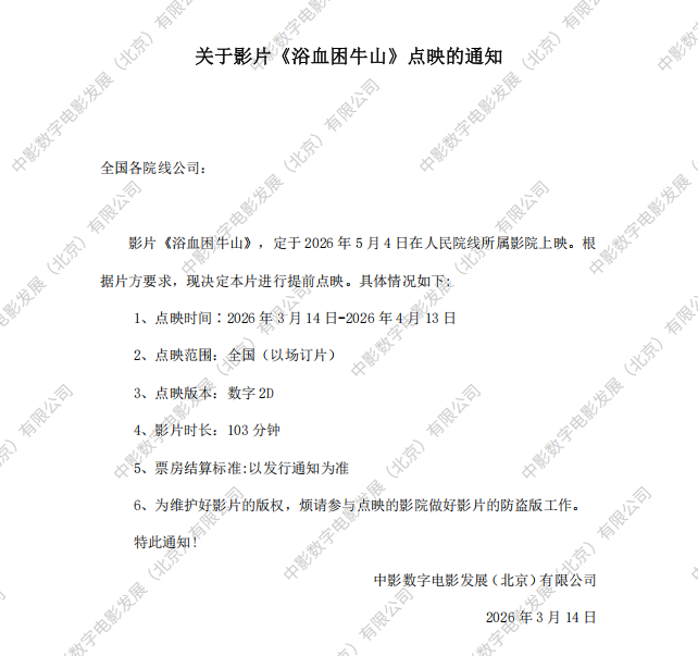 《浴血困牛山》变更上映日期的通知