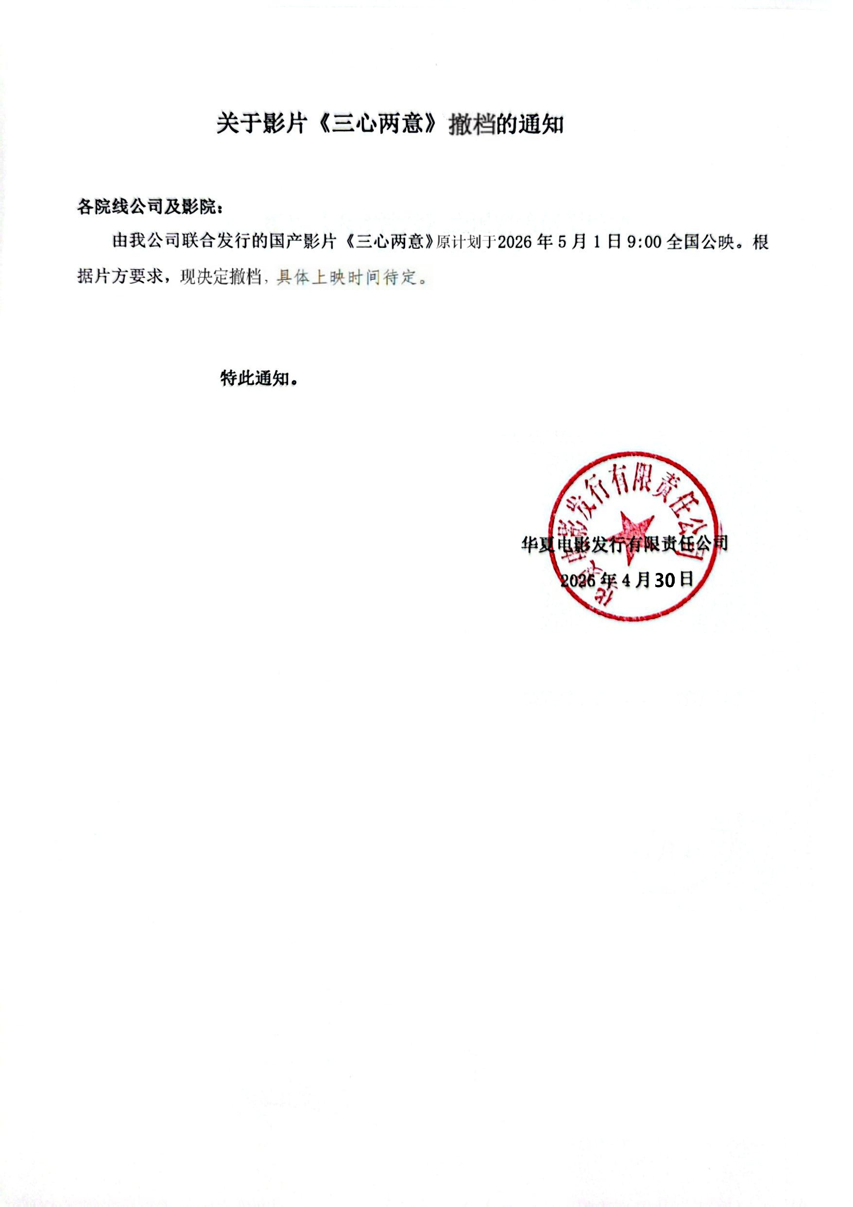 《三心两意》发行通知